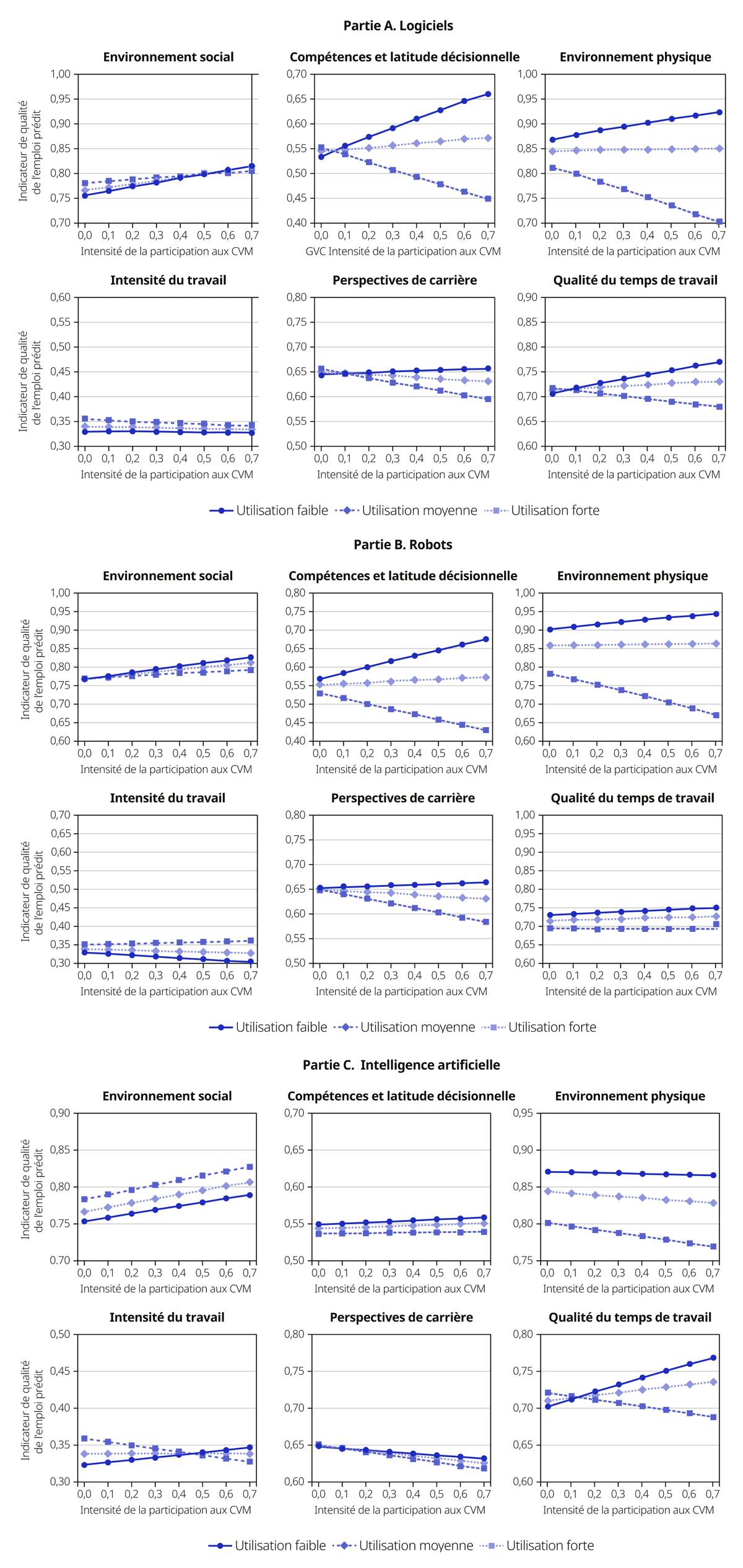 Dans la majorité des cas, les différences en fonction du degré d’utilisation des technologies sont faibles (les lignes se chevauchent) et, lorsqu’il en existe, elles ne concernent que certaines dimensions de la qualité de l’emploi. Pour ce qui est de l’interaction entre l’utilisation des technologies et le lien entre CVM et qualité de l’emploi, la situation est nuancée. Dans les professions qui utilisent beaucoup les logiciels et les robots (figure 1, parties A et B), l’intensification de la participation aux CVM va de pair avec une dégradation de dimensions de la qualité de l’emploi telles que l’environnement physique, les compétences et la latitude décisionnelle ou encore les perspectives de carrière. L’inverse est vrai pour les professions qui font moins appel aux logiciels et aux robots, en particulier pour les dimensions environnement physique et compétences et latitude décisionnelle. Il ne faut cependant pas en déduire que les facteurs technologiques influent de manière significative (y compris en termes économiques) sur la relation entre qualité de l’emploi et CVM, l’ampleur des changements prédits montrant que l’interaction a un impact très faible (voir l’échelle de l’axe des ordonnées). Il en va de même s’agissant des technologies qui reposent sur l’IA (figure 1, partie C): pour la plupart des dimensions de la qualité de l’emploi, la variation induite par une intensification de la participation aux CVM est la même pour toutes les professions, indépendamment du degré d’utilisation de l’IA, et elle est de très faible ampleur.