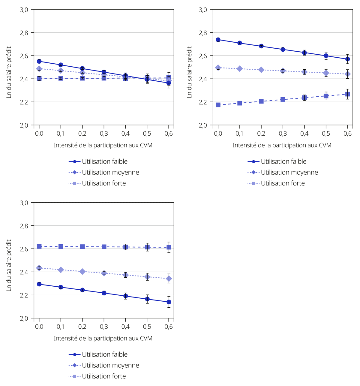 Impact d’une évolution de la participation aux CVM sur le logarithme du salaire prédit, pour différents degrés d’utilisation des technologies (illustration des résultats présentés dans le tableau 4)